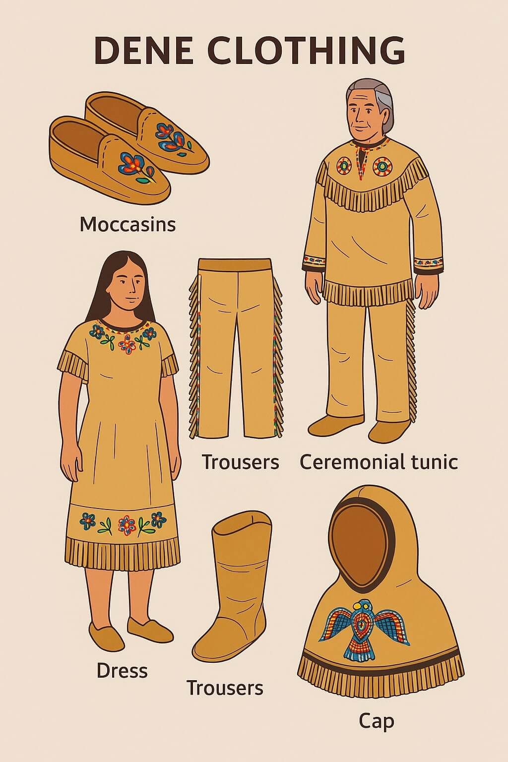 La vestimenta tradicional incluye moccasins (zapatos de piel), y ropas adornadas con cuentas y patrones que reflejan la pertenencia a un clan. Durante ceremonias importantes, como el Pow-wow, se usan trajes ceremoniales elaborados que muestran una rica ornamentación.
